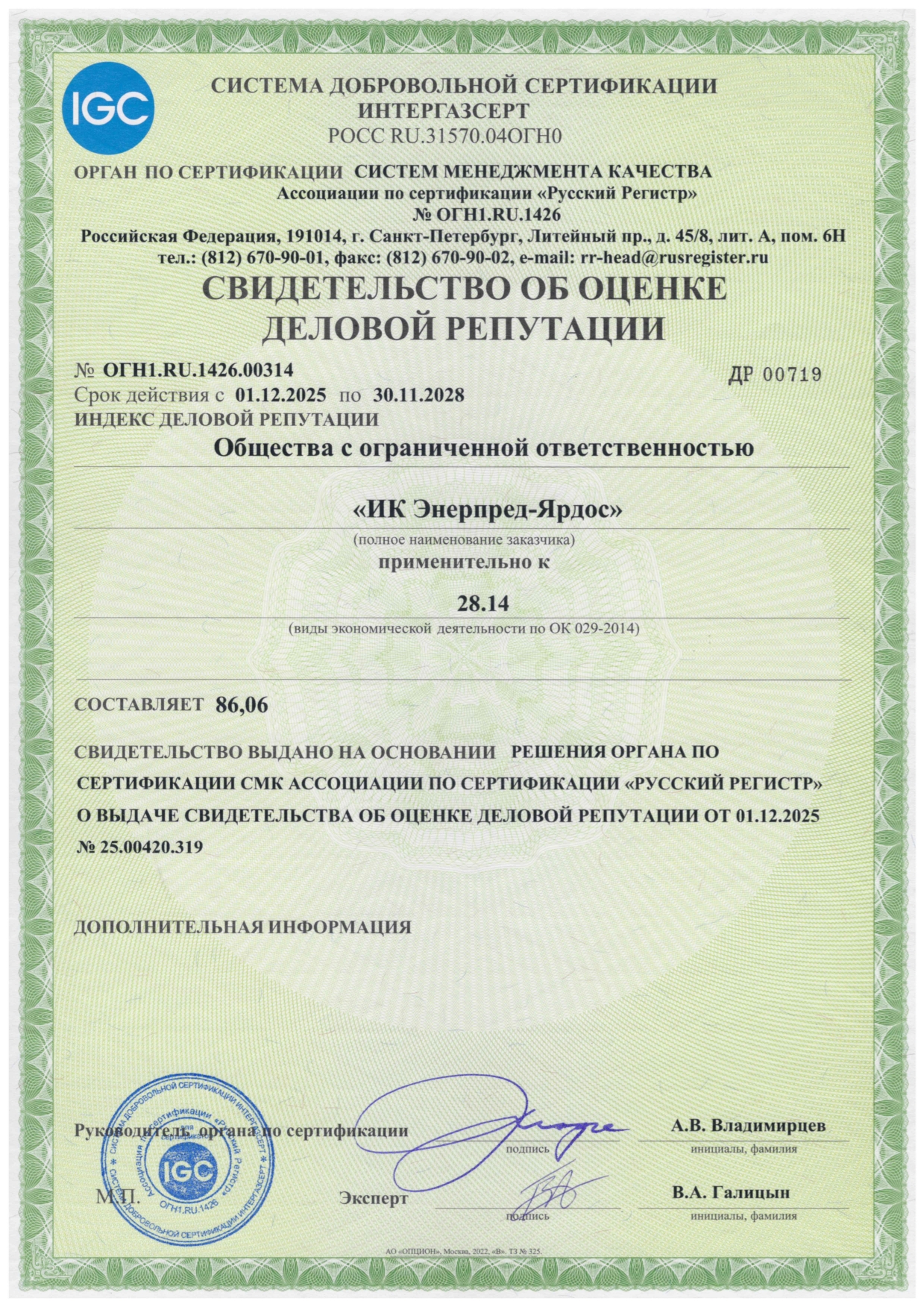 Интергазсерт. Свидетельство об оценке деловой репутации